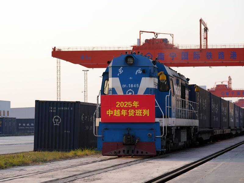 1月15日,X9101次列车装载着果酱、饮料、饼干和奶茶粉从南宁南站启程,经凭祥铁路口岸出境,驶向越南安员。这是今年广西开行的首趟中越年货班列,为越南人民欢度春节送去浓浓的“年味”。